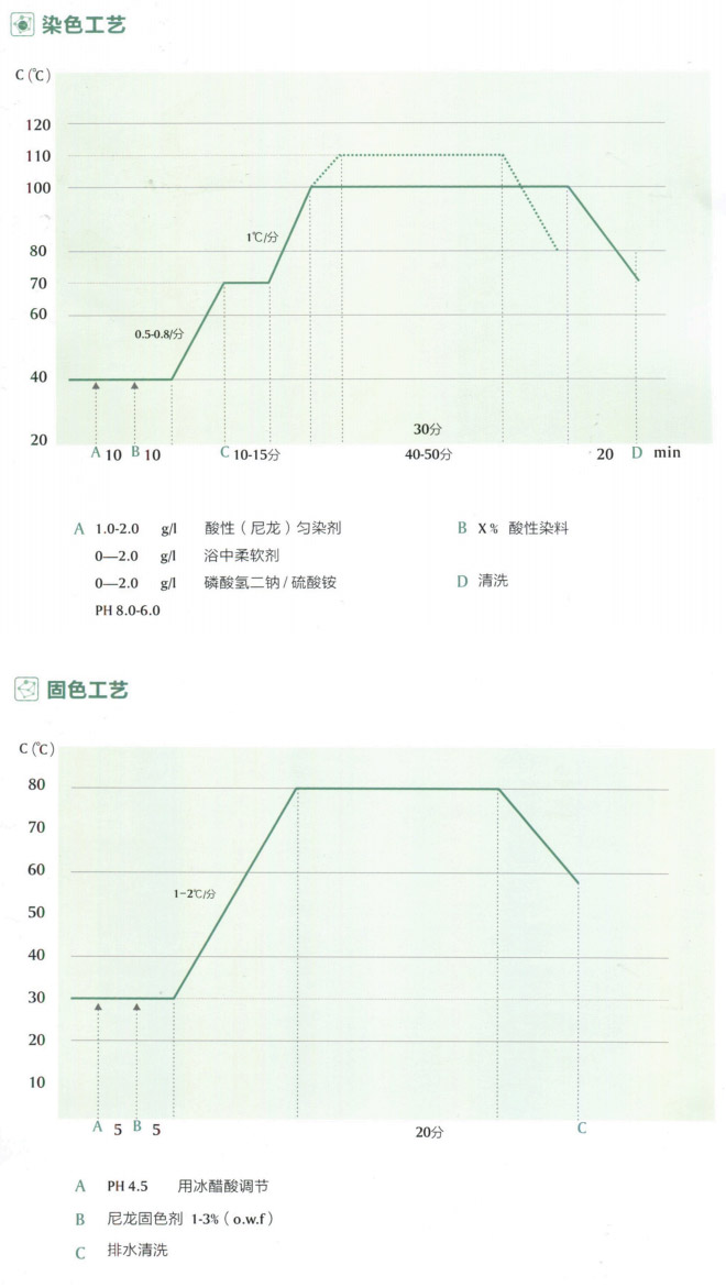 該產品屬于賽德倫E系列染料。該系列染料是高移染高牢度的金屬絡合染料,適合使用于極淺至中等深度染色。在不同染色深度,都有高等級的日曬牢度性能。高溫定型色變極小,特別適合內衣面料的耐高溫壓模。淺色時可在PH=6-8左右染色。