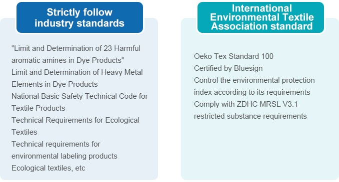 Our company carries out product quality control in strict accordance with the quality requirements related to dyes in the standards of "Limit and Determination of 23 Harmful Aromatic Amines in Dye Products","Limit and Determination of Heavy Metal Elements in Dye Products","National Textile Product Basic Safety Technical Specification","Ecological Textile Product Technical Requirements","Environmental Label Product Technical Requirements Ecological Textile Product" and so on. In addition, in order to strictly control quality and maintain market competitive advantage, our company has passed Bluesign certification, and our products are controlled according to their environmental protection indicators according to their limit requirements. At the same time, we refer to the Oeko Tex Standard 100 standard formulated by the International Environmental Textile Association and ZDHC (Zero Emission of Hazardous Chemicals Alliance) standard.